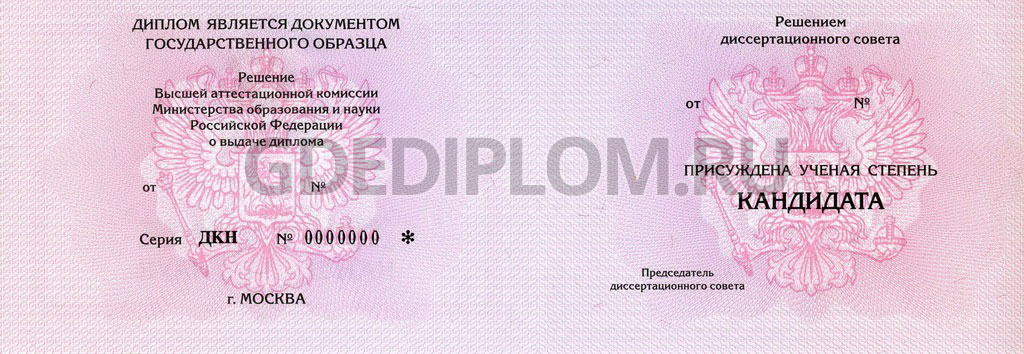 Получить кандидатскую степень можно по итогам защиты кандидатской диссертации. У нас же Вы можете купить диплом кандидата наук без какой-либо подготовки. Изготавливается на оригинальном бланке гособразца (Гознак), заполняется по стандартам Минобрнауки .